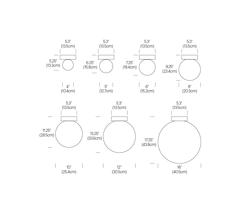 Proportion and ScaleWe've expanded our globe size offering to include 4" (10cm), 5" (13cm), 6" (15cm), 8" (20cm), 10" (25.5cm), 12" (30.5cm), 16"(40cm), and 24"(60cm) with balancing posts in chrome, brass, rose gold, gunmetal, and matte black to satisfy a wide range of applications and decor.
