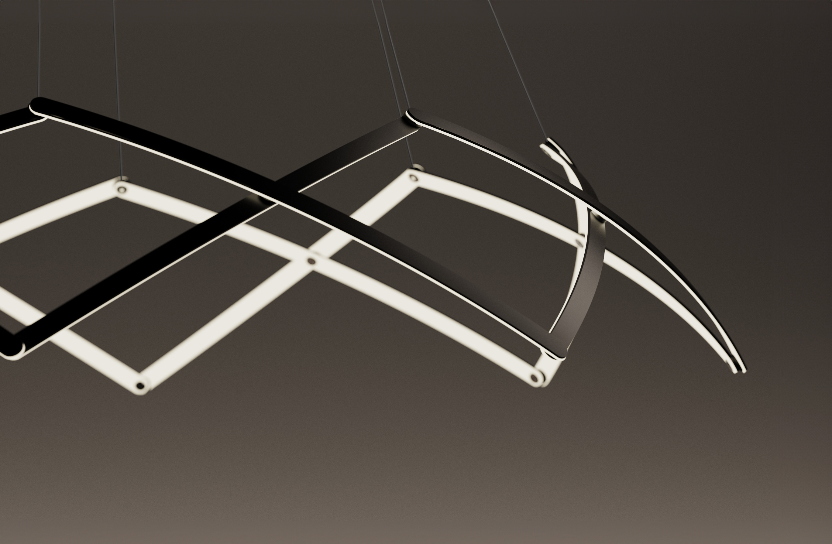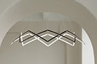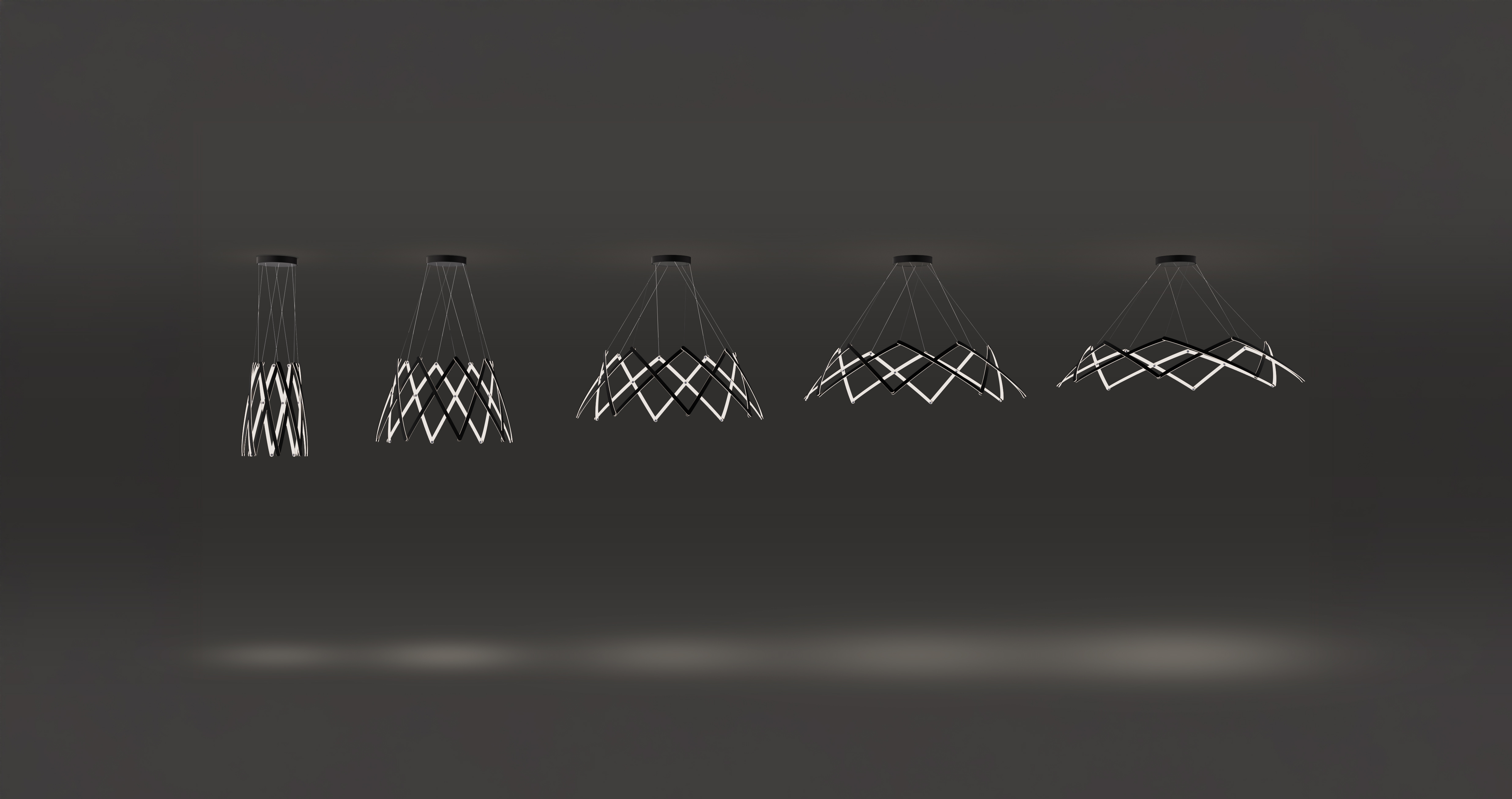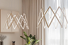 Stella is a dynamic pendant light that can be effortlessly expanded to a wide range of sizes from 10”(25.4 cm) to 59” (150cm) in diameter depending on user needs. Made up of multiple interwoven aluminum arm segments with strategically placed pivot joints, this dynamic fixture transforms from inward facing illumination to downward facing direct lighting when expanded outward.